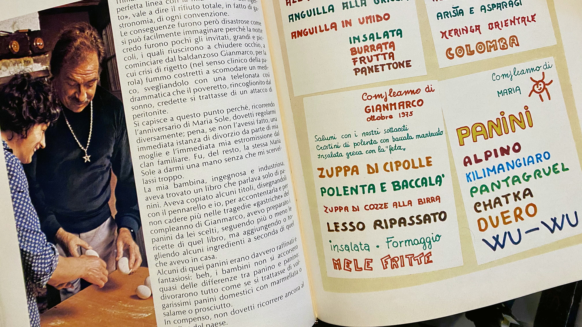 Le foto dei piatti sono pochi, tante invece quelle che raccontano la quotidianità della sua cucina a Velletri, in quella "casa vecchia" che adesso è una Casa Museo magica. Ma l’intermezzo visivo davvero interessante è costituito dalla grafica “a pennarello”. Come a pennarello era l'etichetta del suo vino, La Tognazza Amata. Si, Ugo amava scrivere ricette e menu a mano. Con pennarelli colorati componeva titoli a grandi lettere, elenchi storti, volutamente irregolari, frecce, disegni rapidi, cornici decorative.